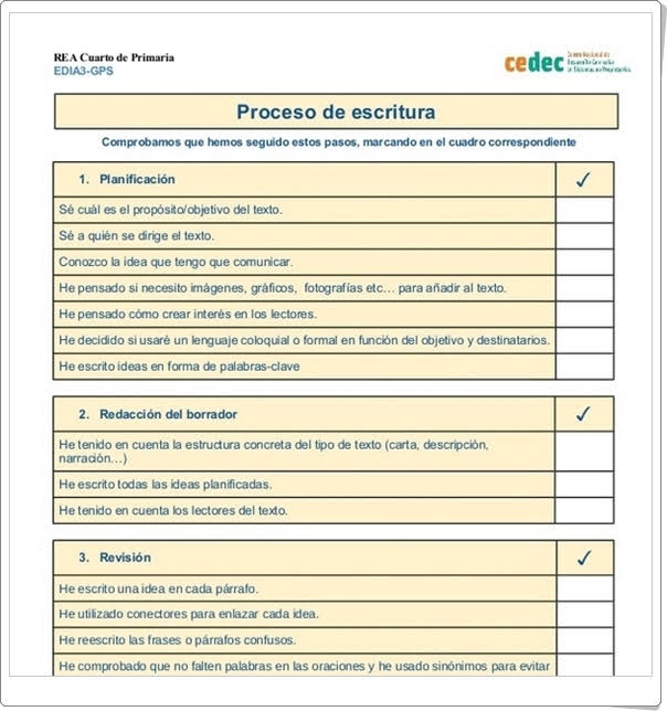 Muy buena rúbrica para la evaluación del "Proceso de escritura", elaborada por el "REA GPS del Proyecto EDIA para Educación Primaria" y publicada por el CEDEC de España.